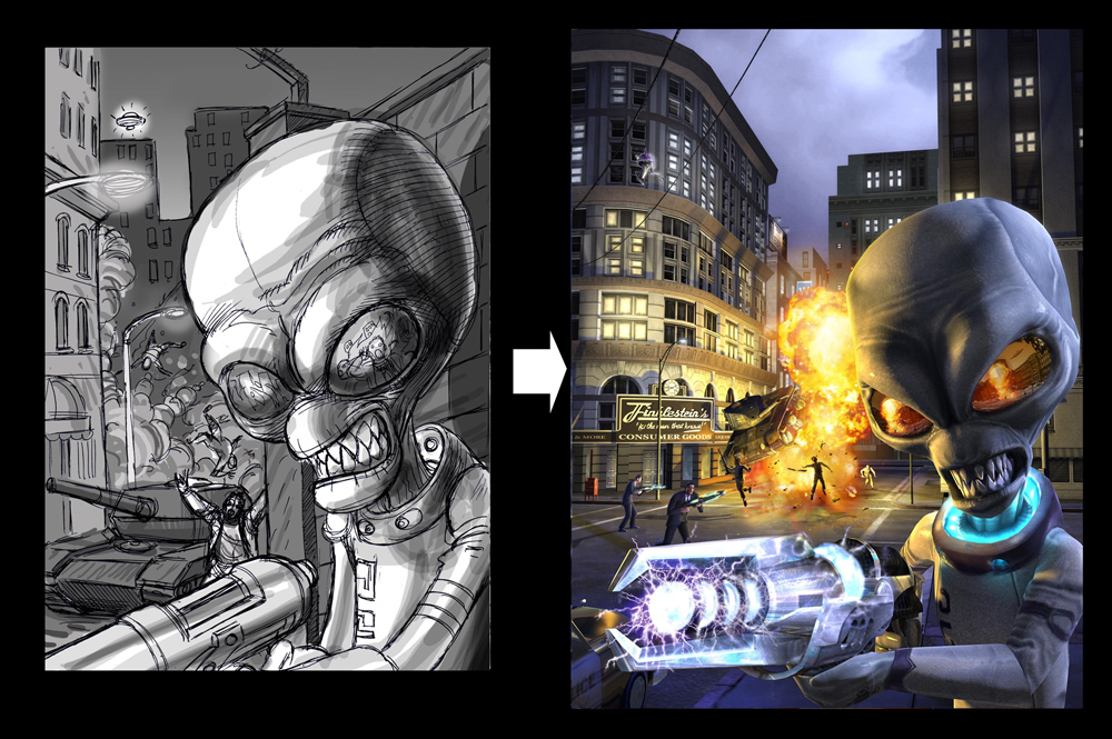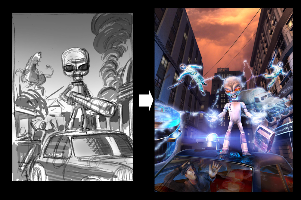 Magazine Promotional Covers, Pandemic Studios, Australia (I received concept at left, and had to realize a full color concept based on asset assembly, vfx, painting, modeling etc).