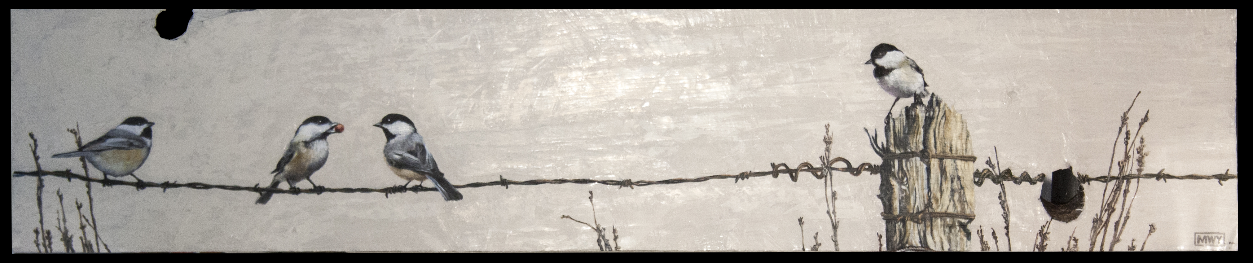 The Berry (Chickadees), Oil on barnwood, 45 x 9″