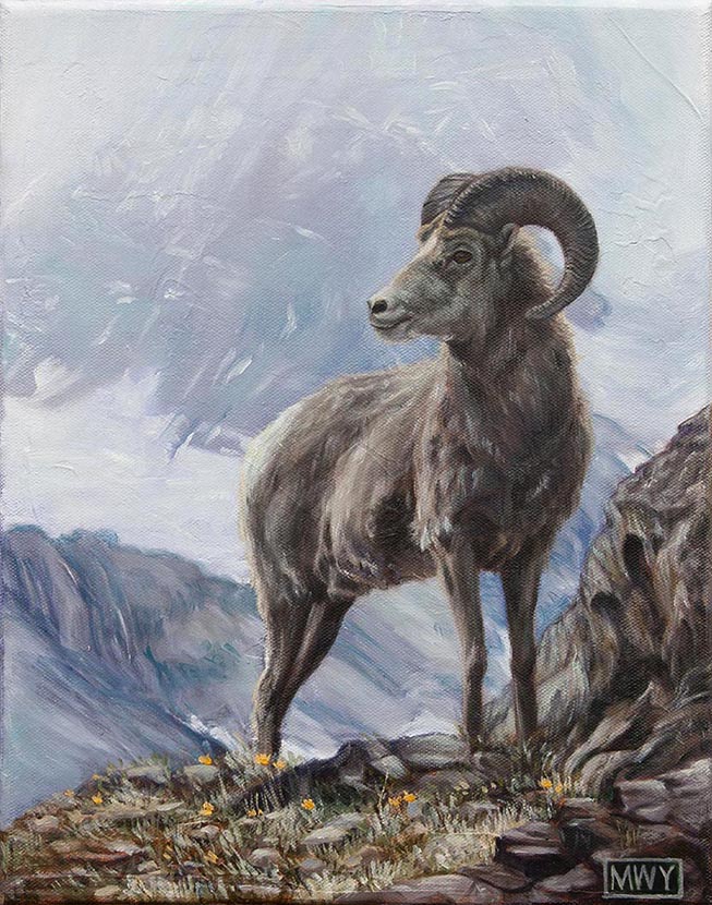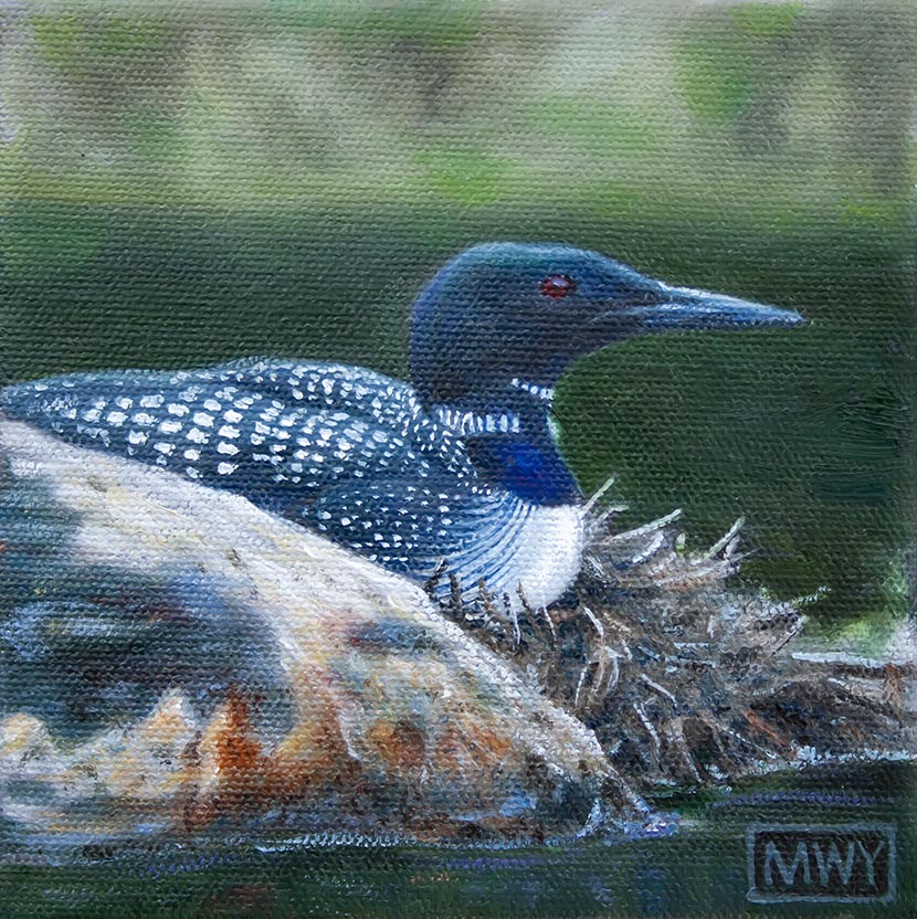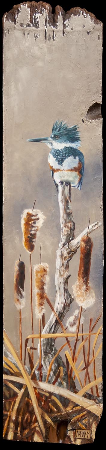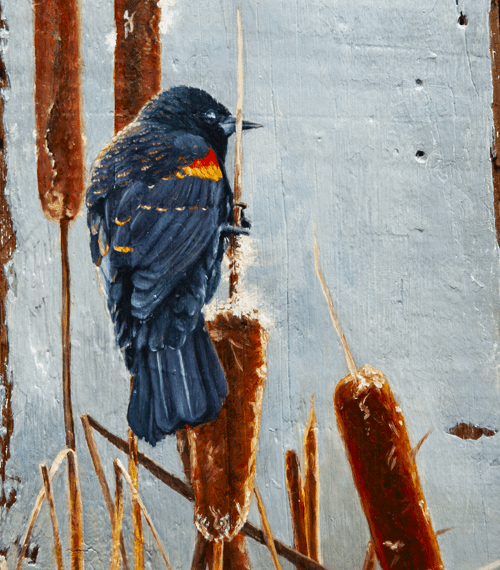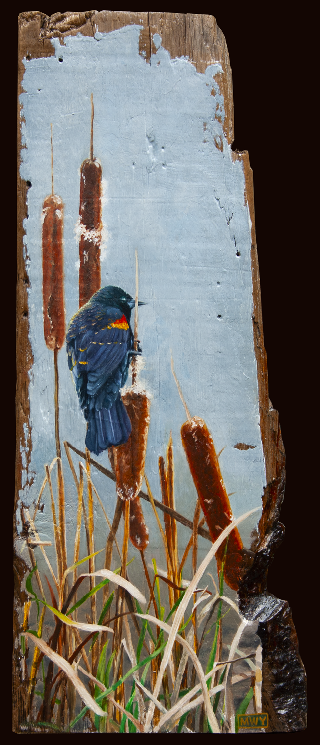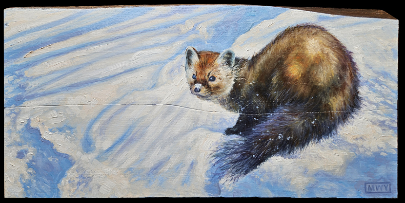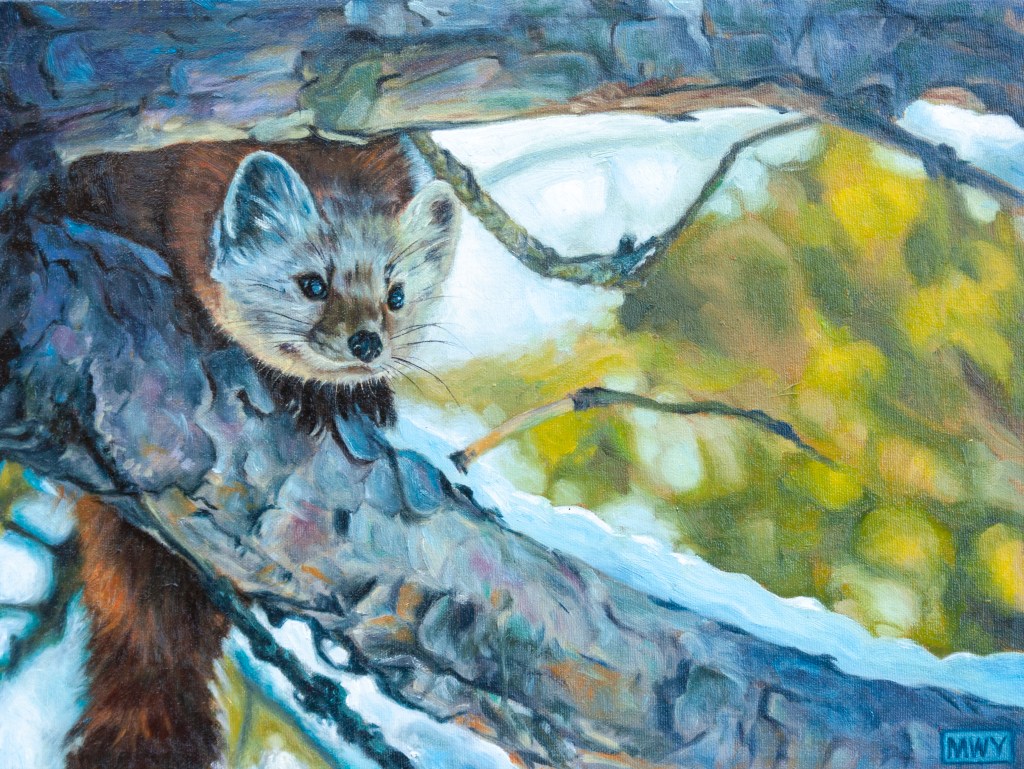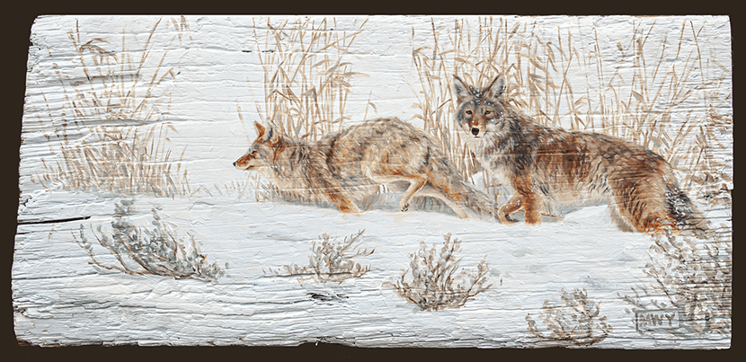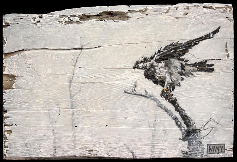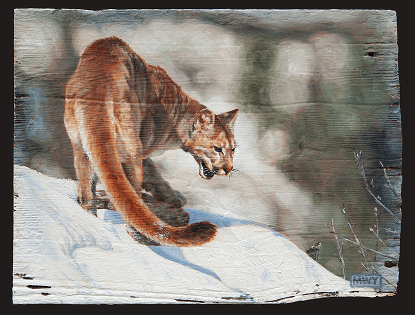 Golden Eagle, Oil on barnwood 17 x26″ Red Fox, Oil on canvas 12 x 12″ Cougar, Oil on barnwood 12 x 16″ Curiosity #1, Oil on canvas, 12 x12″Curiosity #2, Oil on canvas, 10×10″Elk, Oil on canvas, 12 x 16″ Blue Heron, Oil on canvas, 8×8″ Polar Bear, Oil on canvas 8×8″ Bighorn in the Rockies, Oil on canvas 11×14″ Pine Marten, Oil on barnwood 17 x 9″ Pine marten, Oil on Canvas, 16×12″White Tailed Deer, 15×16″ Oil on barnwoodBrook Trout, Oil on CanvasRed-Winged Blackbird, Oil on barnwood, 10 x 29″American Redstart, 12×12″ Oil on CanvasBlue-Winged Warbler, Oil on canvas 8×10″Loon on Nest, Oil on canvas 6×6″ Raven, Oil on canvas, 9 x 12″ American Crow, Oil on canvas, 8×10″Song Sparrow, Oil on canvas 8×8″ Osprey in Snowstorm, Oil on barnwood 16×24″ Monarch, Oil on canvas 6×6″ Kingfisher, Oil on canvas, 10×12″KingfisherIn the Reeds, Oil on barnwood 12×44″ Running Hares #2, Oil on barnwood 11×17″ Rabbit, Oil on panel, 4 x 4″Hare, charcoal sketch, 5 x 7″ Fox, Oil on barnwood 7×7″ Coyotes, Oil on barnwood, 12 x 25″ Red Fox, conte sketch, 5 x 7 ” Canada Geese #2, Oil on barnwood 10×10″ Geese and Clouds, Oil on canvas, 12 x 5″ Grey Jay, Oil on wood panel 8×10″ Pine Grosbeak, Oil on barnwood, 4×6″Ruby-Throated Hummingbird, Oil on barnwood, 5×7″ Peregrine Falcon, Oil on canvas, 18×24″Sand Pipers, Oil on barnwood, 30×6″