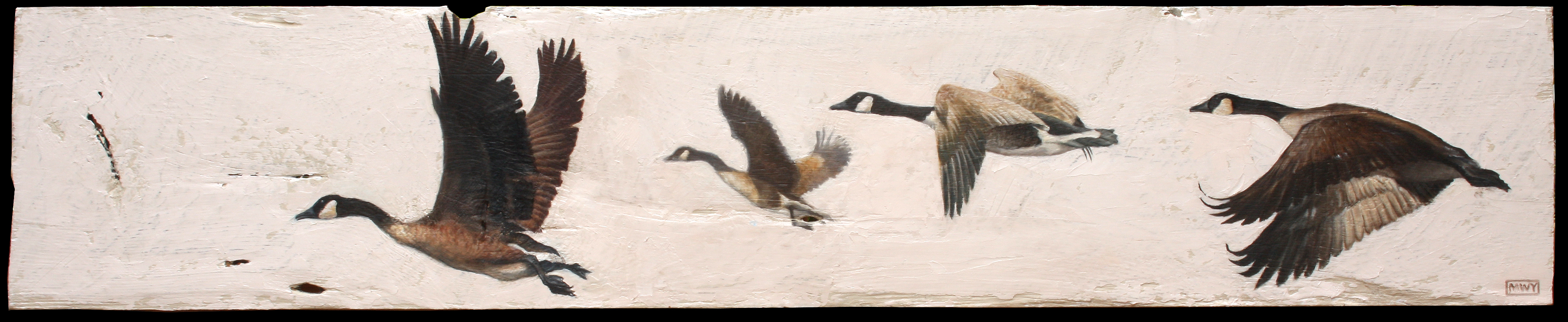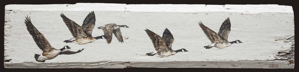 Flight (Canada Geese), Oil on barnwood, 56 x 11″