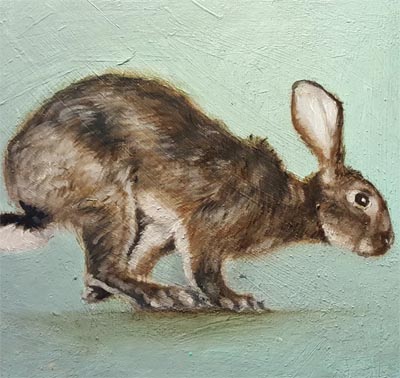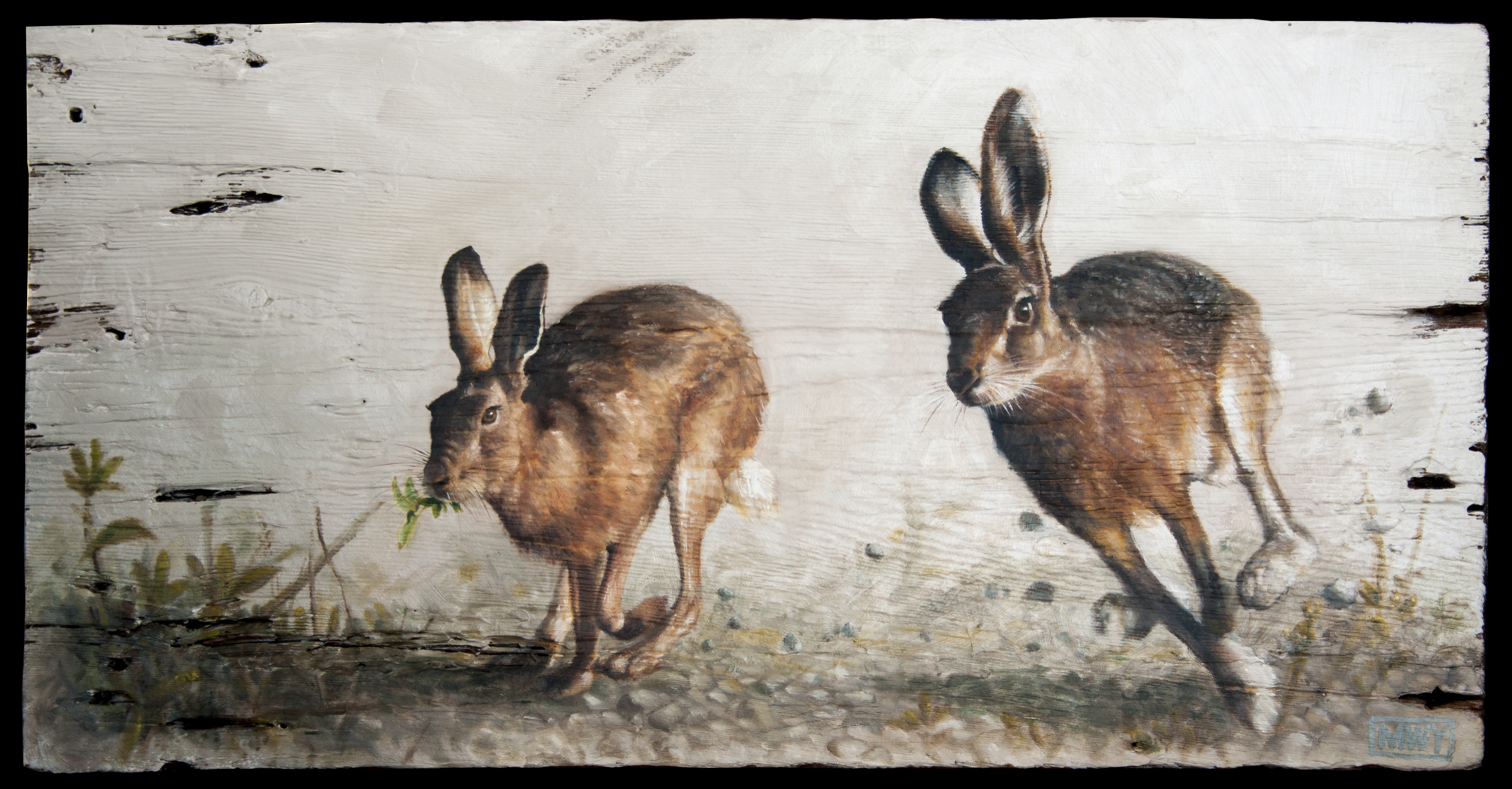 Fleeing Hares, Oil on distressed barnwood, 32 x 16″
