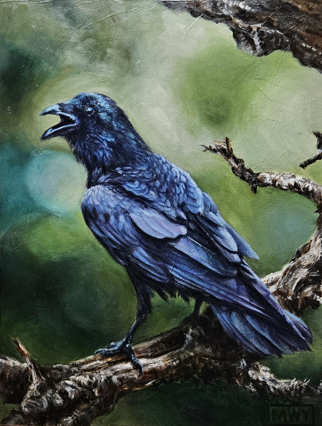 The Call (Raven), Oil on wood panel, 9 x 8″