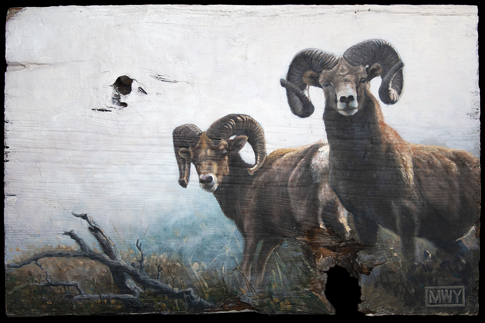 Bighorn Sheep, Work in Progress. Oil on distressed barnwood, 18 x 12″