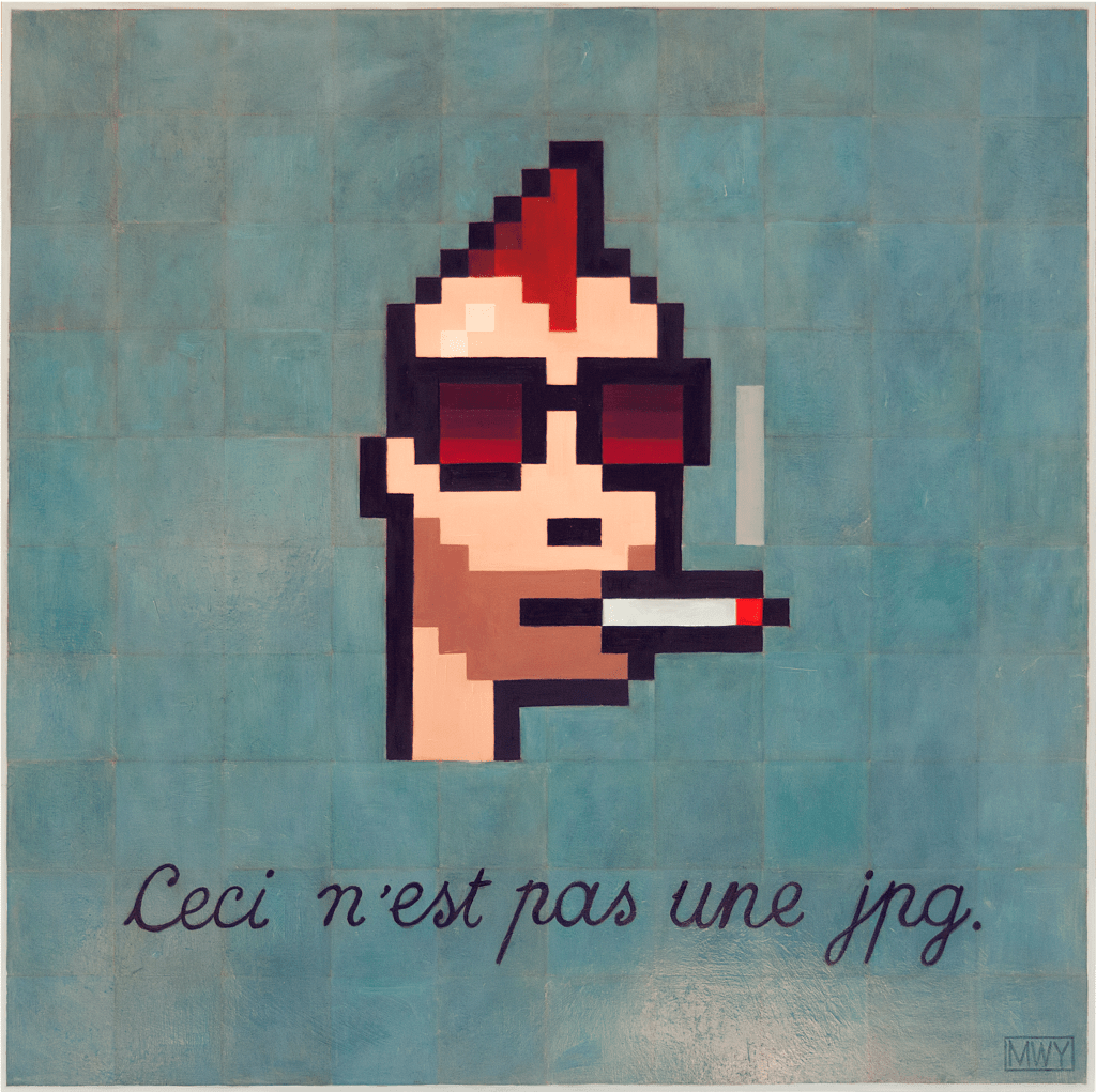 A painting I did in protest of NFTs. I replicated a real NFT design, and wanted an abstract subtle background that was kind of reminiscent of jpg image compression. Oil on panel, 4ft x 4ft.